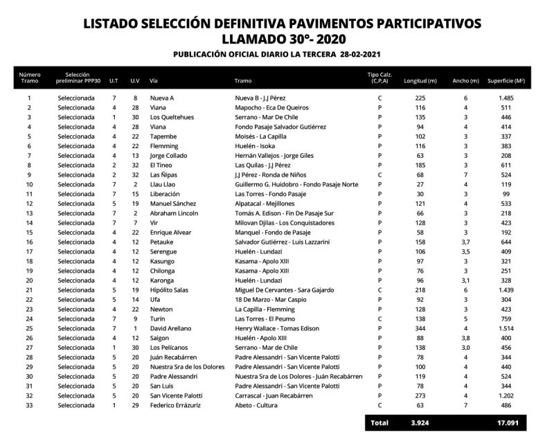 A través de la prensa se dio a conocer el 28 de febrero el listado definitivo de los tramos seleccionados por el Servicio de Vivienda y Urbanismo (Serviu) para el Llamado 30 del Programa de Pavimentos Participativos. Se trata de 33 tramos de calles aprobados que iniciarán su reparación en 2021, lo cual significará la renovación de 3.924 metros lineales correspondientes a cinco calles y 29 pasajes de la comuna.