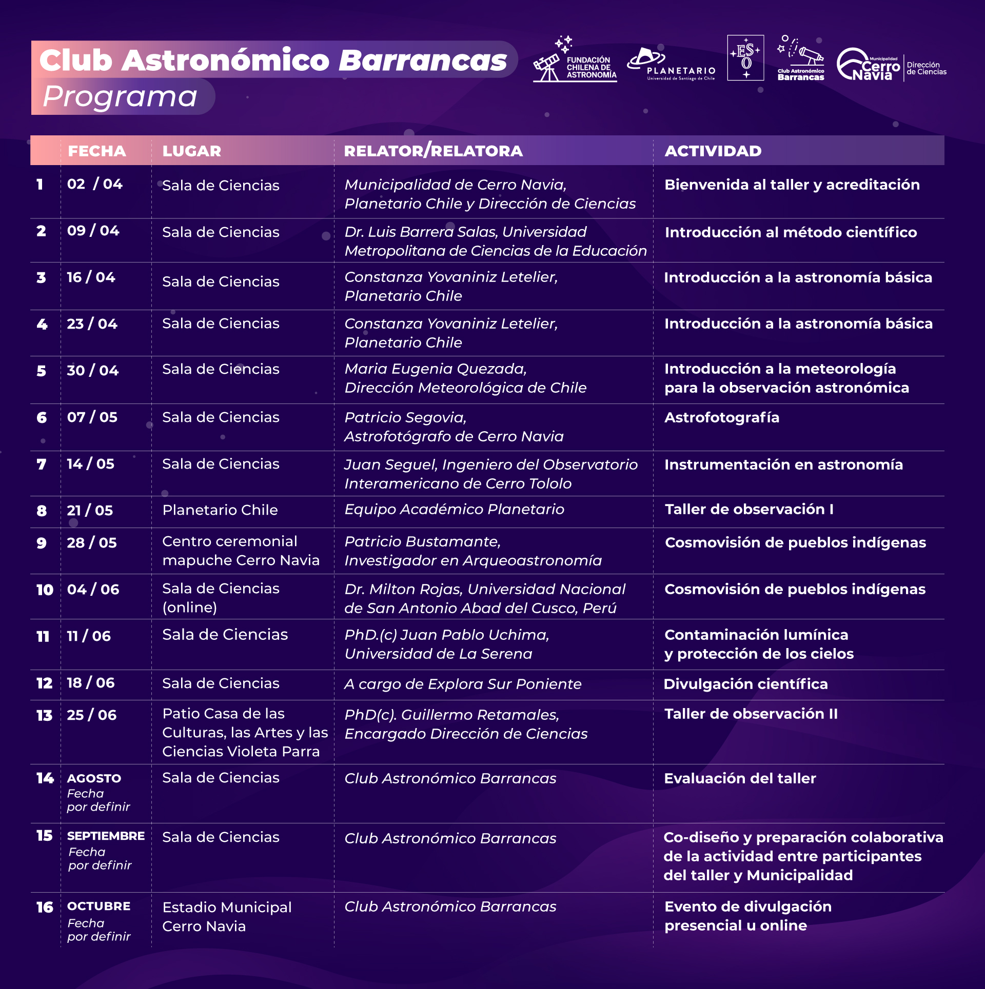 Con la adquisición de un telescopio robótico, una cámara fotográfica para toma de imágenes astronómicas y la implementación de una estación meteorológica, junto a un entretenido programa de actividades teóricas y prácticas desarrolladas por astrónomas/os y profesionales destacados/as (ver gráfica), el Club Astronómico Barrancas será un espacio de acceso democrático a áreas de la cienciatales como la astronomía, meteorología, astrofotografía, y la cosmovisión de pueblos indígenas, entre otras.