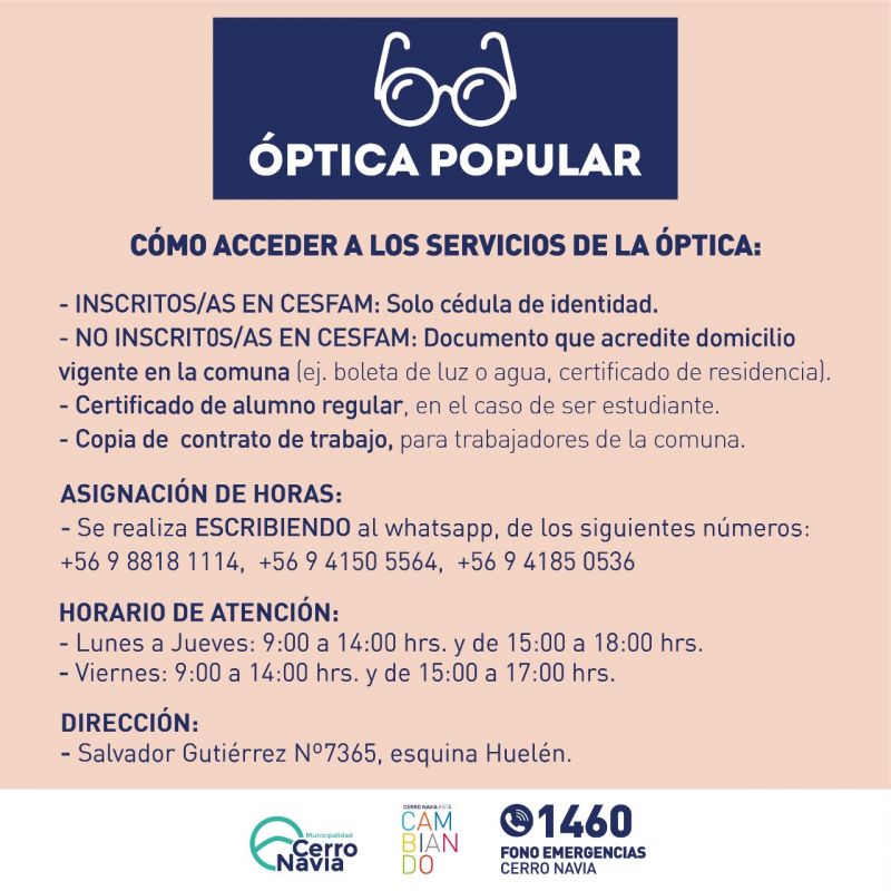 Les recordamos que el horario de atención  de la Óptica Popular es de lunes a jueves de 09:00 a 18:00 horas y  el viernes hasta las 17:00 horas, con un cierre por colación desde las 14:00 a 15:00  horas. Además, este servicio es para quienes vivan, trabajen, estudien en la comuna, pertenezcan a alguno de nuestros CESFAM o acrediten la residencia con comprobante de domicilio.