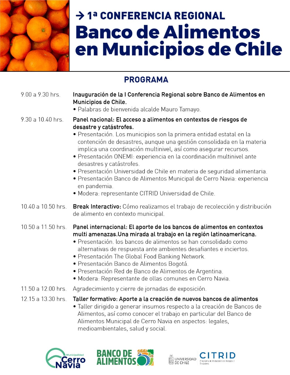En la conferencia, también participará el Programa de Reducción de Riesgos y Desastres (CITRID) de la Universidad de Chile, el Banco de Alimentos de Chile, Bogotá y Argentina, el Global Food Banking Network, y una representante de las ollas comunes que proliferó en Cerro Navia.