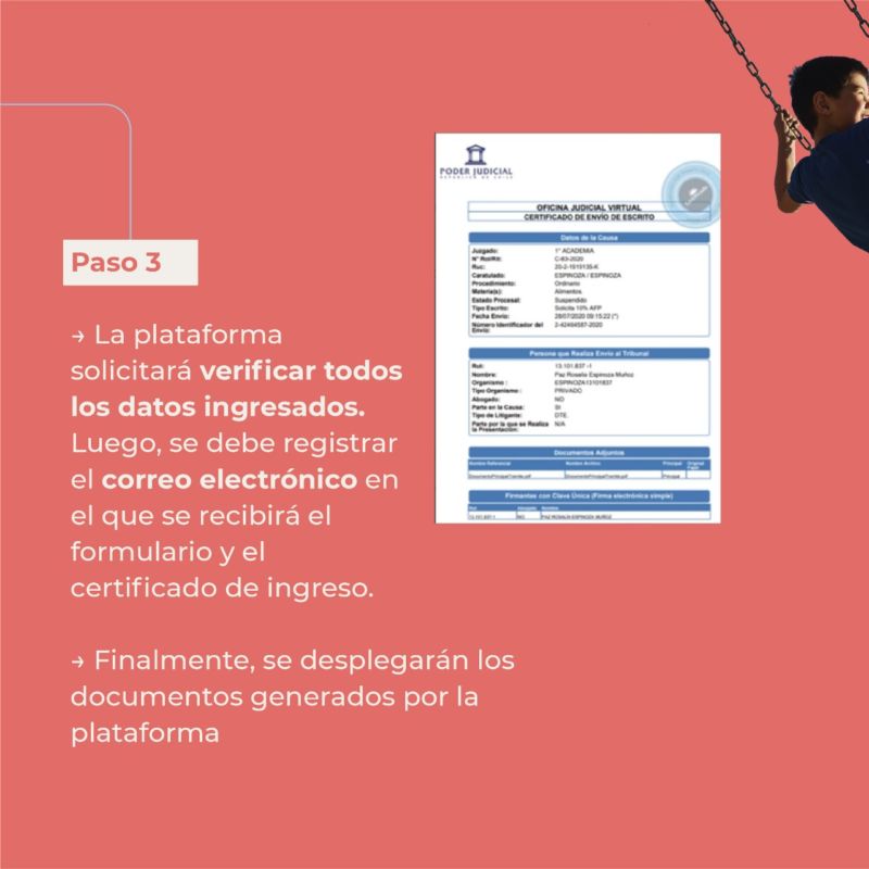 – La plataforma pedirá verificar los datos ingresados y registrar el correo electrónico, en el que se recibirá el formulario y el certificado de ingreso.
