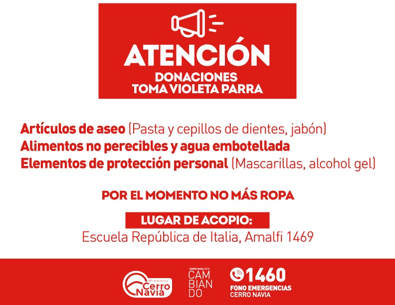 Comunicamos a toda la comunidad que cerca de las 12.30horas de este domingo 29 de noviembre, y por causas que se encuentran en investigación,se produjo un lamentable incendio en la toma Violeta Parra, ubicada en Rodoviario N°8699, Cerro Navia.
