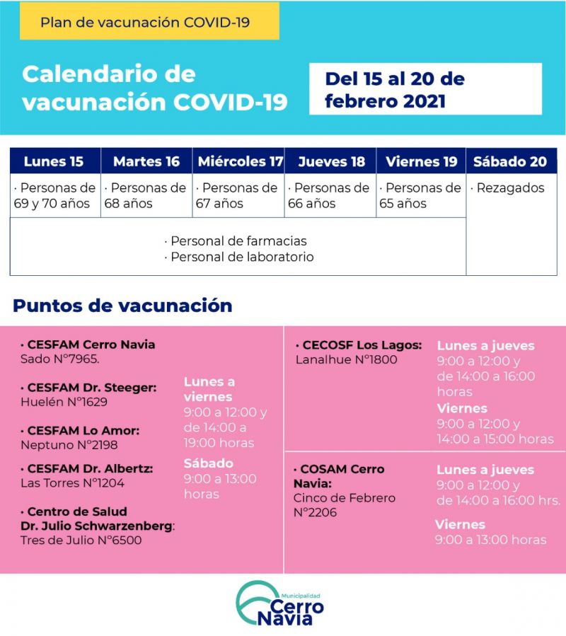 Con la intención de acelerar el proceso de vacunación, los cuatro CESFAM de la comuna y el Centro de Salud Dr. Julio Schwarzenberg atenderán de lunes a viernes de 9:00 a 12:00 horas y de 14:00 a 19:00 horas, y los sábados de 9:00 a 13:00 horas. Por su parte, el Cecosf Los Lagos abrirá sus puertas de lunes a jueves de 9:00 a 12:00 y de 14:00 a 16:00 horas, y los día viernes de 9:00 a 15:00 horas. El Cosam Cerro Navia vacunará de lunes a jueves entre 9:00 a 12:00 y 14:00 a 16:00, y los días viernes de 9:00 a 13:00 horas.