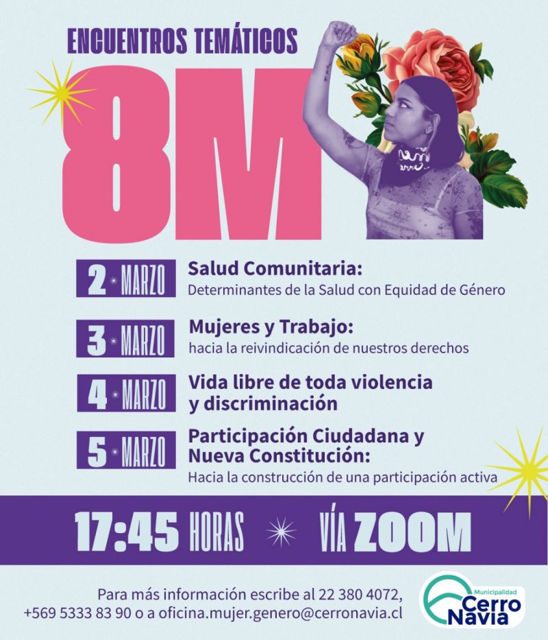 En el marco de la Conmemoración del Día Internacional por los Derechos de las Mujeres, Niñas y Disidencias Sexuales, la Oficina de las Mujeres y la Equidad de Género de la Municipalidad de Cerro Navia, realizará entre el 2 y el 5 de marzo cuatro encuentros temáticos digitales con las mujeres de nuestra comuna.