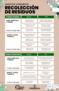Informamos a nuestras vecinas y vecinos y a la comunidad en general los nuevos horarios de recolección de residuos domiciliarios, tanto en sus turnos diurnos como vespertinos que comenzarán a operar desde el 02 de mayo del 2025.