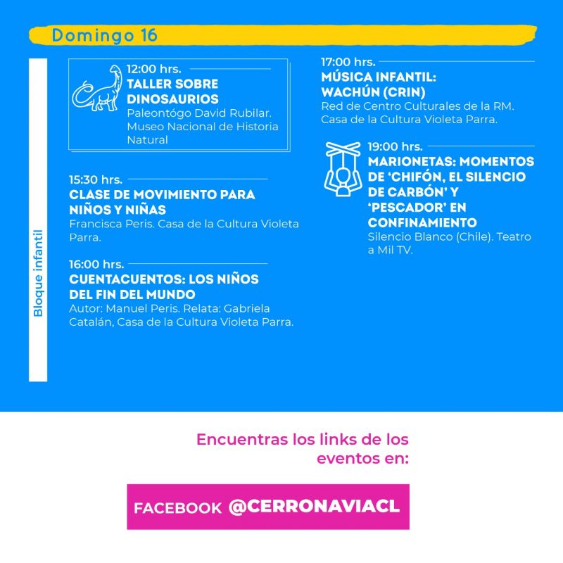 El domingo 16 de agosto los niños y niñas podrán disfrutar de cuenta cuentos, música y marionetas, y de una entretenida charla virtual  a las 12 horas sobre la historia de los dinosaurios, realizada por el paleontólogo del Museo de Historia Natural, David Rubilar.