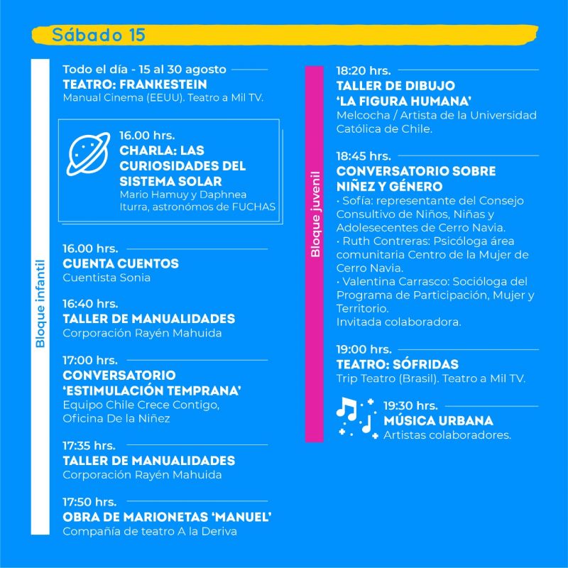 Este fin de semana tendremos una programación especial y muy entretenida en el «Festival Virtual por una Nueva Niñez». Con motivo de la celebración del día del Niño y la Niña, el sábado 15 de agosto se podrá ver vía internet teatro, cuenta cuentos y aprender manualidades y sobre la figura humana. Además, a las 16 horas los destacados astrónomos Mario Hamuy y Daphnea Iturra de FUCHAS realizarán una charla virtual sobre las curiosidades del sistema solar.