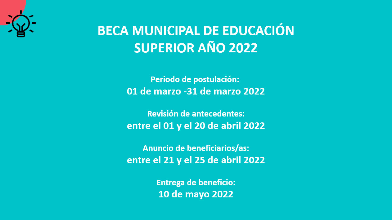 Postula a la Beca Municipal de Educación Superior 2022 Publicado el: 28 febrero 2022 Postula completando el formulario que encontrarás en este link. Lo que debes saber: Descarga toda la información aquí. Isabel Cabrera2022-02-28T18:31:52-03:00