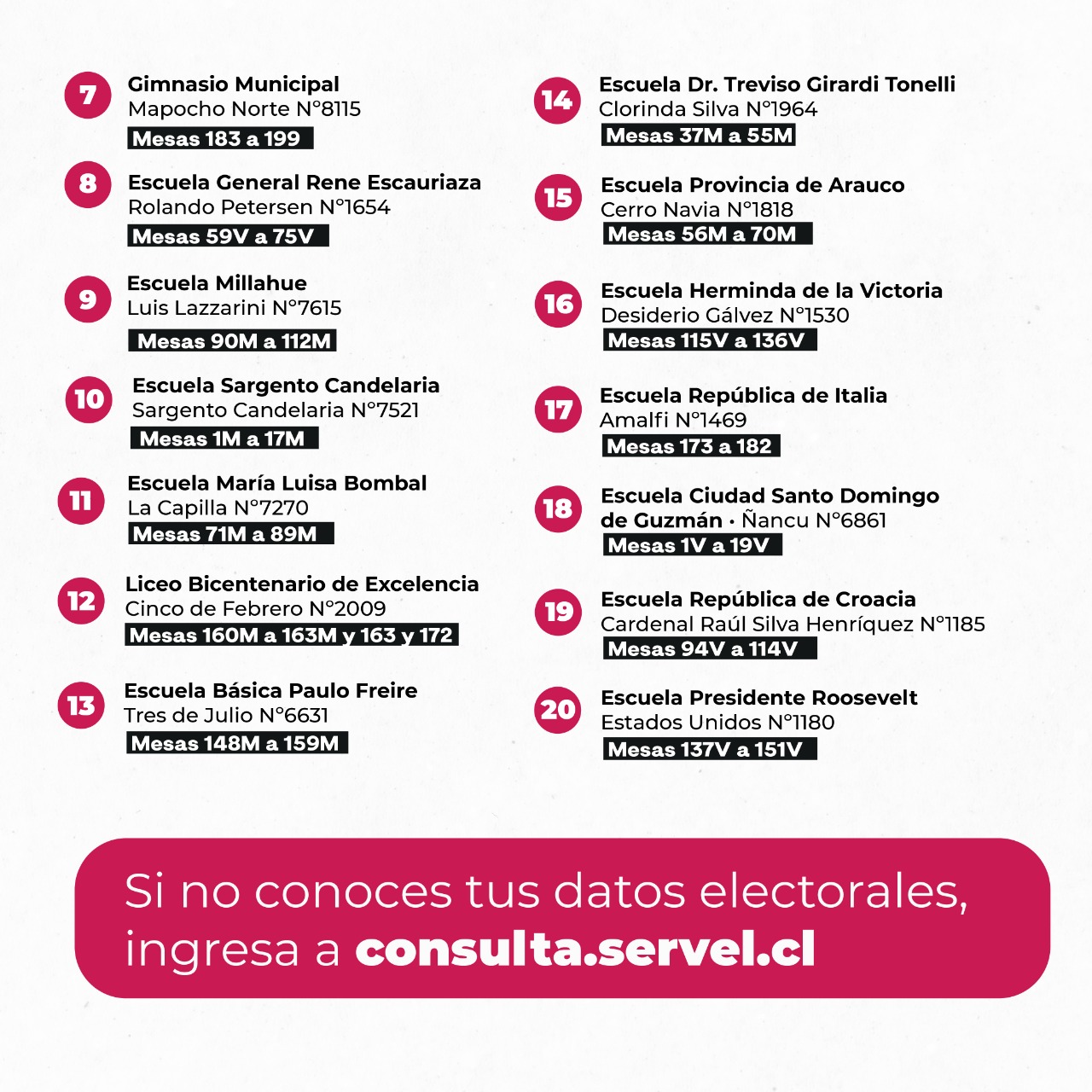 Es posible que tu local de votación haya cambiado. Consulta con tu RUT dónde debes votar, cuál es tu mesa y si eres o no vocal de mesa en el siguiente link: https://consulta.servel.cl/