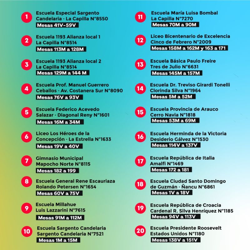 En Cerro Navia tendremos 20 establecimientos para ejercer el derecho a sufragio, y con este aumento su local de votación podría haber cambiado. Le recomendamos revisar este mapa para ver direcciones y mesas de votación, y si tiene dudas, confirmar su local de votación en www.plebiscitonacional2020.cl