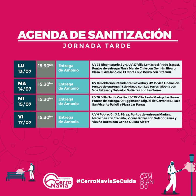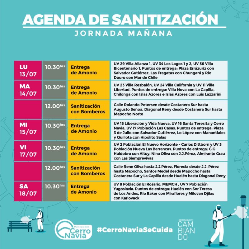 Debemos contener la pandemia de COVD-19 que tanto ha golpeado a Cerro Navia. Por eso, seguimos realizando sanitizaciones con los equipos de funcionarios municipales y entregando amonio cuaternario en los distintos sectores. Además, no olviden que este producto químico es un poderoso desinfectante de bacterias y virus, en especial el SARS CoV 2, ideal para aplicar en las superficies lisas de las casas.
