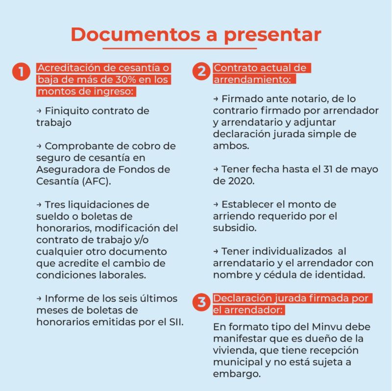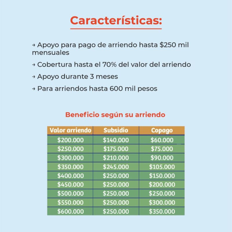 La medida está destinada a 100 mil familias que hayan tenido caídas en sus ingresos del 30%, que actualmente arrienden una vivienda y que esta no supere los $600 mil mensuales. Los beneficiarios podrán recibir  hasta del 70 % de la cobertura de su arriendo, durante tres meses y por un valor mensual hasta  $250 mil.