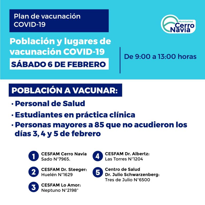 Con el objetivo de dar respuesta de forma segura y oportuna a la demanda de vacunas contra el COVID-19, la Municipalidad de Cerro Navia, a través de la Corporación Municipal de Salud, decidió sumar los días sábado 6 y 13 de febrero al calendario de inoculación estipulado por el Gobierno.